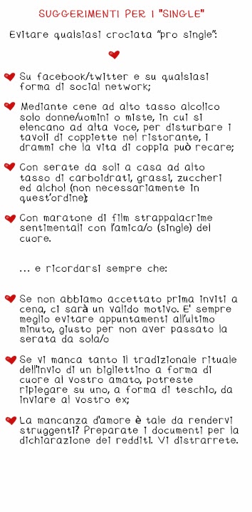 non sono più single ma lo sono stata per diversi san valentino di seguito, e la cosa non mi ha mai dato grandi problemi. alla fine è un giorno come un altro, e comunque anche essere in coppia ha i suoi lati negativi, altrochè!